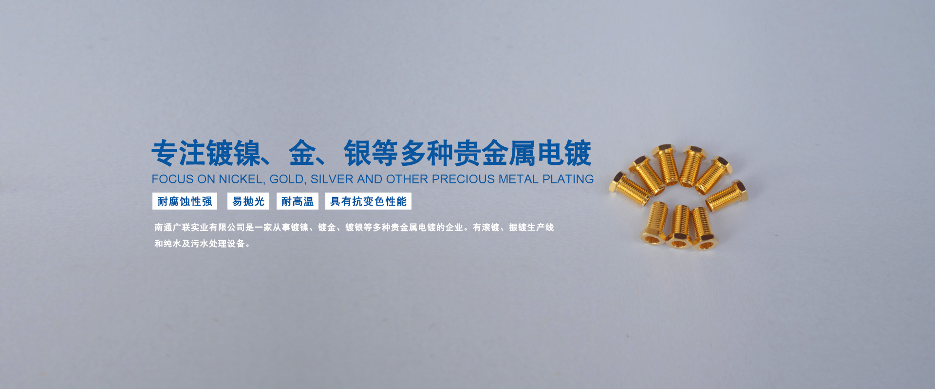 南通廣聯(lián)實(shí)業(yè)有限公司是一家從事鍍鎳、鍍金、鍍銀等多種貴金屬電鍍的企業(yè)。有滾鍍、振鍍生產(chǎn)線(xiàn)和純水及污水處理設(shè)備。